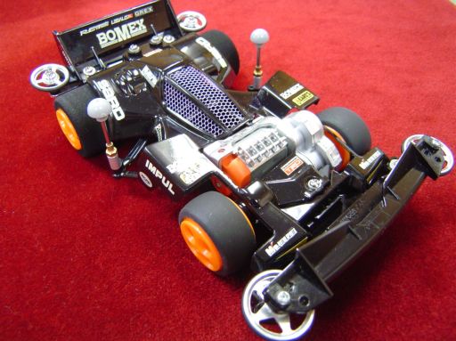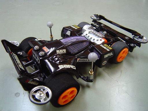| ミニ四駆最初の思い出ある作品です。 改造の解説本にあった作例を参考に、FMシャーシに乗せ換えました。 エンジン剥き出しの迫力を強調する為に、放熱フィンやモーターキャッチのシルバー塗装に、穴あけ加工をしました。 タイヤもワイドなものを選んで、トルクチューンモーターのオレンジ色と合わせて見ました。 コーナーでの安定性確保の為、フロント加重を意識し前輪のみゴムタイヤとしフロントダンパーを二重に補強しました。 実際のレースでは周りの注目を浴びながらコーナーを安定してクリヤーしましたが、残念ながら全体的に重くなり上位に入賞することは出来ませんでした。 一度もコースアウトする事が無かったので、軽量ボディーながら今まで無傷でいられました。 ![]() ![]() ![]() 2004.6.15 |